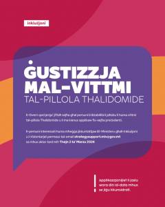 The Government is reopening a call for applications from persons with disabilities who believe they are victims of the Thalidomide pill and who, for some reason, did not apply in the previous call. These persons are encouraged to contact the Ministry for Inclusion and Volunteering via the email strategysupport.miv@gov.mt by not later than Monday 2 March 2026.